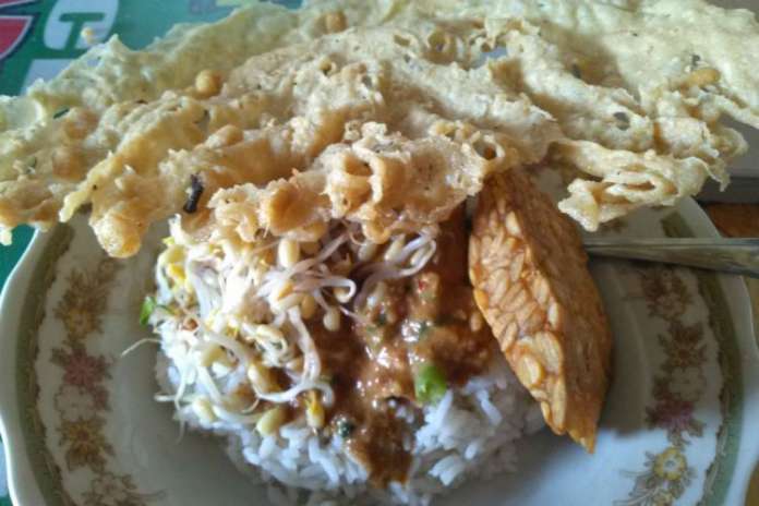 LokalKarya.id – Nasi pecel memang sudah umum ada di mana-mana, tapi berbeda untuk yang satu ini. Nasi Pecel Mbok Sarti di utara Pasar Sumberayu, Kecamatan Muncar, Banyuwangi ini punya ciri khas kuat. Salah satunya, guyuran sambal pecel di atas nasi dan sayur, terkenal dengan rasa super pedas. Serta rempeyek dengan ukuran sangat lebar memberi memberi ciri khas pada kuliner ini.